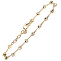 Created by Charles & Colvard, Moissanite has exceptional luster, brilliance and fire. This tennis bracelet features 15 round stones surrounded by a circle of gold. The piece is crafted in 14kyg. Its intense beauty, durability, and rarity make it a must have for your collection. Plus, Moissanite is completely Certified to authenticate its value and properties.(phone and web orders only)