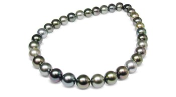 Tahitian black pearls are the most exotic and mystical of all pearls harvested in the world. Especially this 13mm x 13.7mm sized necklace. Adding to its mystic is the broad array of colors that this peculiar Silver Lipped oyster from French Polynesia delivers. The lip of the oyster is not unlike a rainbow displaying the full color spectrum in a narrow stripe bordering the oysters rim. Each pearl on this spectacular multicolor necklace borrows one color from the black pearl color spectrum and refines it into a dark based incandescent glow forming none other than a black pearl rainbow.