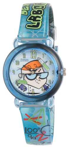 This fun and playful Dexter wristwatch from Armitron features a plastic case that encloses a white and round blue dial with black hands and green Arabic-numeral indexes. The mischievous face of Dexter himself appears on the durable plastic dial, while Dexter's formulas and diagrams are scattered on the blue wristband. The plastic wristband fastens with a buckle clasp.