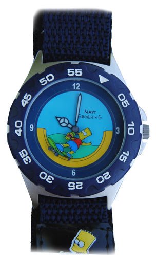 Bart Simpson skate sport watch with blue wrap band easy velco fastener. Approx., 1.1/2inch diameter. Comes in great collectable packaging. Quartz - battery operated.