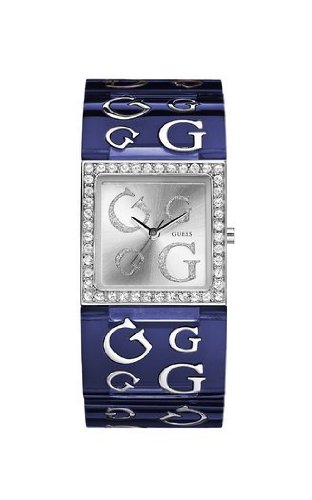 Color yourself happy with this beautiful blue watch from GUESS. Sapphire-colored resin bangle bracelet with self-adjusting links and "G" design. Mixed metal case. Swarovski crystal bezel. Silvertone dial with small silvertone logo and Swarovski crystal "G" logos. Quartz movement. Ten-year limited warranty.