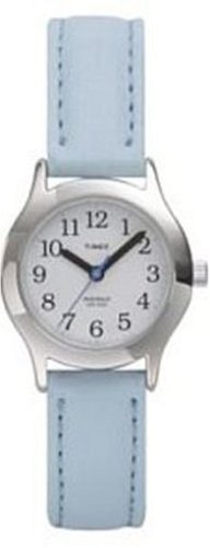 The Timex T77261 My First Timex analog watch is the perfect timepiece complement to more dressy outings. With a more adult design, it has a round, mid-sized silver stainless steel watch case the highly polished bezel that frames a white dial background with easy-to-read Arabic numerals and black baton hands (with blue seconds hand). It also offers water resistance to 30 meters and a pastel ice blue genuine leather strap.