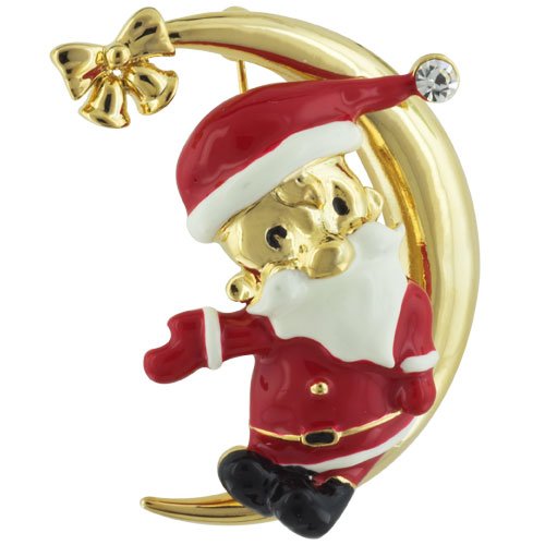 The Santa Claus Rhinestone And Moon Pin Brooch. A great looking brooch is always an appreciated fashion accessory. And a Pugster Santa Claus Rhinestone and Moon Brooch pin is one of the best looking brooches you will find anywhere. Decorated with rhinestones, this cute fashion brooch pin will add a sparkling flair to your jacket lapel or scarf. Measuring 1.3 inches tall by 1.0 inches wide, each 8.2 gram brooch fastens securely with a metal pin.