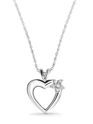 18k White Gold or Yellow Gold Open Heart & Flower Diamond Pendant (1/6 ct. tw.). This high-polish 18k gold pendant has a beautiful flower studded with six prong-set round diamonds. An 18k gold rolo chain runs through the V-shaped bail.