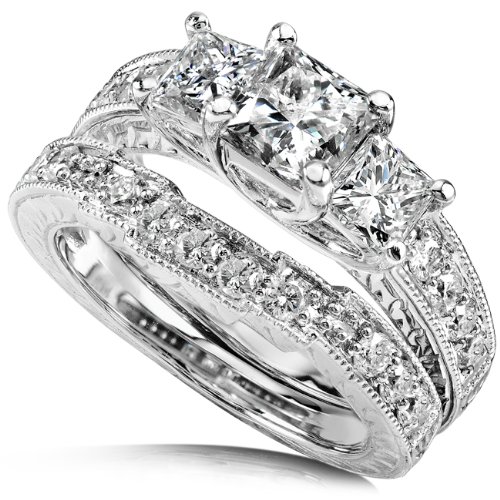 1 3/5ctw Three Stone Princess Cut Diamond Wedding Ring Set (HI/I1) in 14Kt White Gold - Size 7. This gorgeous bridal set features 19 Round Brilliant Diamonds (1/2ct) and 3 Princess-Cut Diamonds (1 1/10ct).