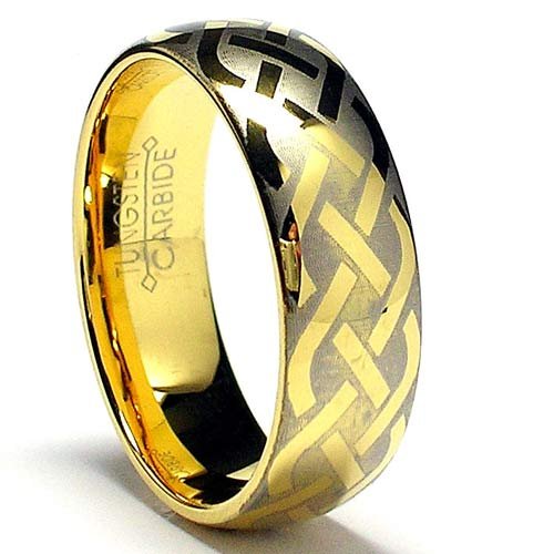 7MM 18K Gold Plated Tungsten Ring with Laser Etched Celtic Design Size 8. This beautiful 18K Gold plated tungsten carbide ring is 7MM in width and comfort fit. It is all high polish with laser etched celtic design. If you are looking for a ring that is scratch proof and forever keep its shine, than our Tungsten Carbide rings are for you.