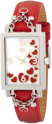 On its long dial, this L Word collection watch features inlaid red hearts and bold Arabic-numeral hour markers at three, six, nine, and 12 o'clock. This charming watch is made with stainless steel construction, including a 26-millimeter case, bezel, and buckle clasp on the matching red-orange leather strap. Powered with Swiss quartz movement, this women's watch is also water resistant to 99 feet.