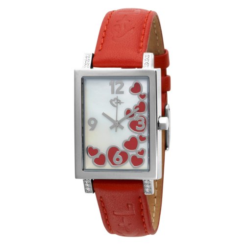 Love Peace and Hope Women's LW129A Time for Love L Word Charm Watch. This Love and Pride timepiece enchants onlookers with ravishing red heart accents and a luxurious white mother-of-pearl dial. On its long dial, this L Word collection watch features inlaid red hearts and bold Arabic-numeral hour markers at three, six, nine, and 12 o'clock.