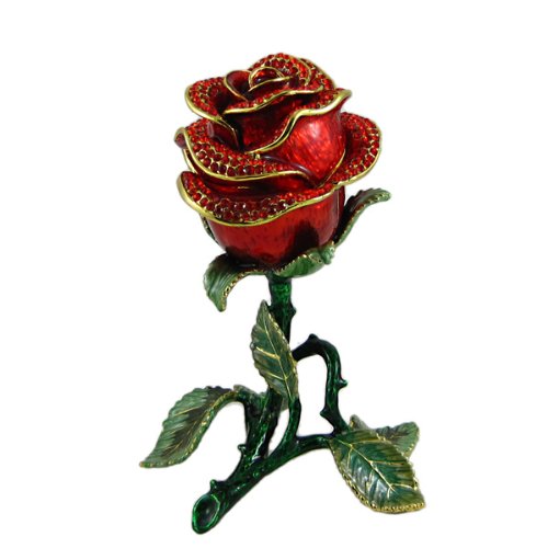 Valentine Red Rose Jewelry Box Bejeweled Large 5.25"H. A sensitive, poetic gift. Totally three dimensional. Possesses all the delicate magic of a real rose. Hand painted enamel- Swarovski Crystal details. Magnetic Closure Inside.